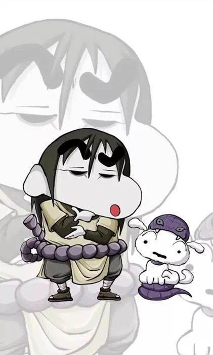 蠟筆小新版的大蛇丸也很有意思,完美還原了蛇叔的形象,而且好像並沒有什麼違和感,旁邊的小白看起來也很炫酷。