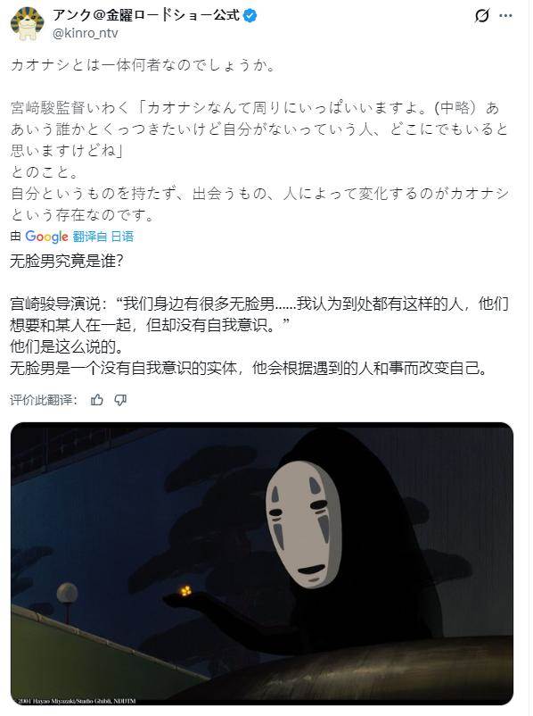 與此同時,官方 X(原 Twitter)賬號也公開了一段宮崎駿導演的幕後訪談內容,重點聊的,正是那個至今仍讓無數觀眾感到不安、又無法討厭的角色——無臉男。