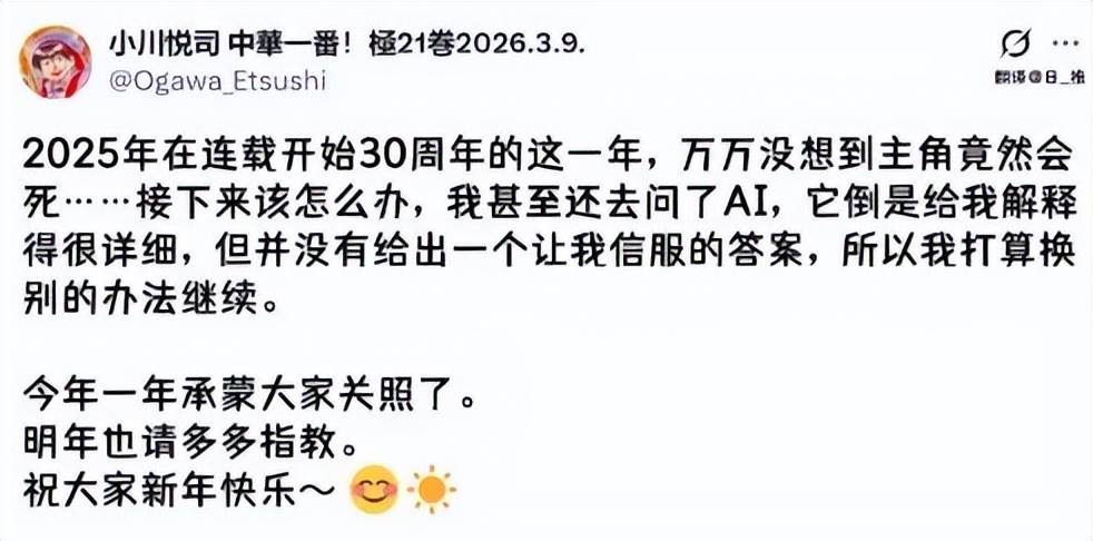 而近日,小川悅司在社交媒體上發文稱自己去年在漫畫連載30週年的時候畫死了劉昴星,這也讓他不知道怎麼繼續後面的內容,為此他甚至還去問了Ai,Ai雖然講了一大堆,但卻沒有給他一個讓人信服的答案,所以他準備換別的辦法繼續。