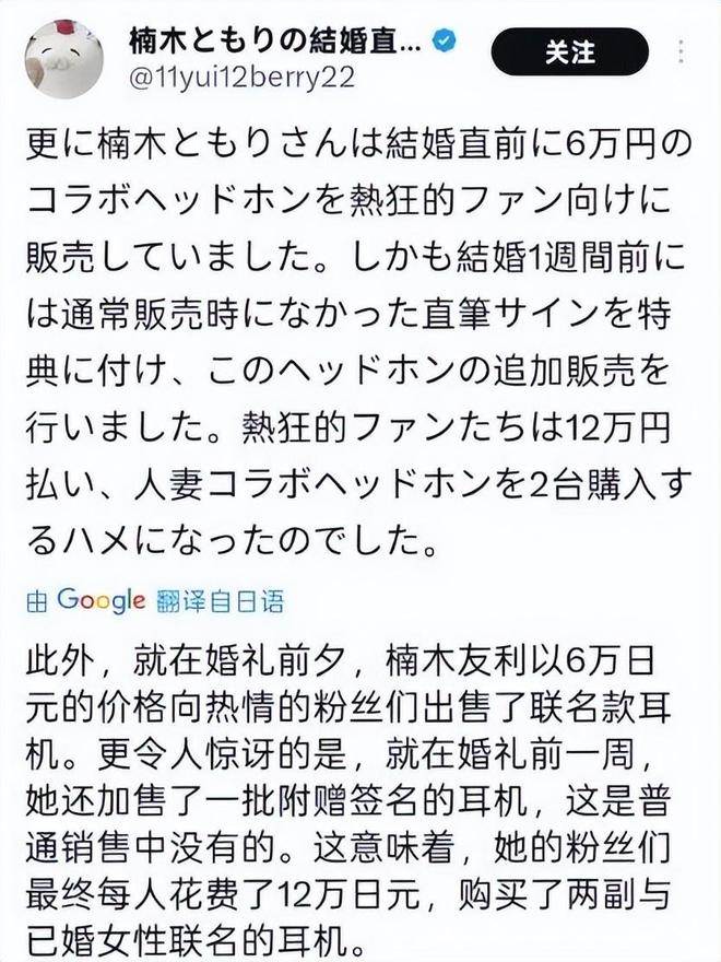 然而就在大家以為這只是一個普通的粉絲因偶像結婚而破防的故事時,事情又發生了反轉,外網有人爆料楠木燈在結婚前瘋狂割粉絲韭菜,比如宣佈結婚前一週賣粉絲6萬日元的簽名聯名耳機,並預售自己的周邊穀子,而粉絲收到穀子得等6個月,宣佈結婚前一個月售賣1.