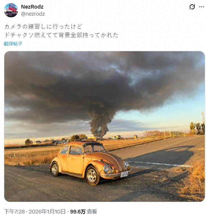結果到了現場才發現背景正在猛烈燃燒,他拍下來的那一刻,甚至都來不及構圖,車、地平線、夕陽、灰色濃煙,全都湊在了一起,于是一張怎麼看都不像現實照片的照片誕生了。