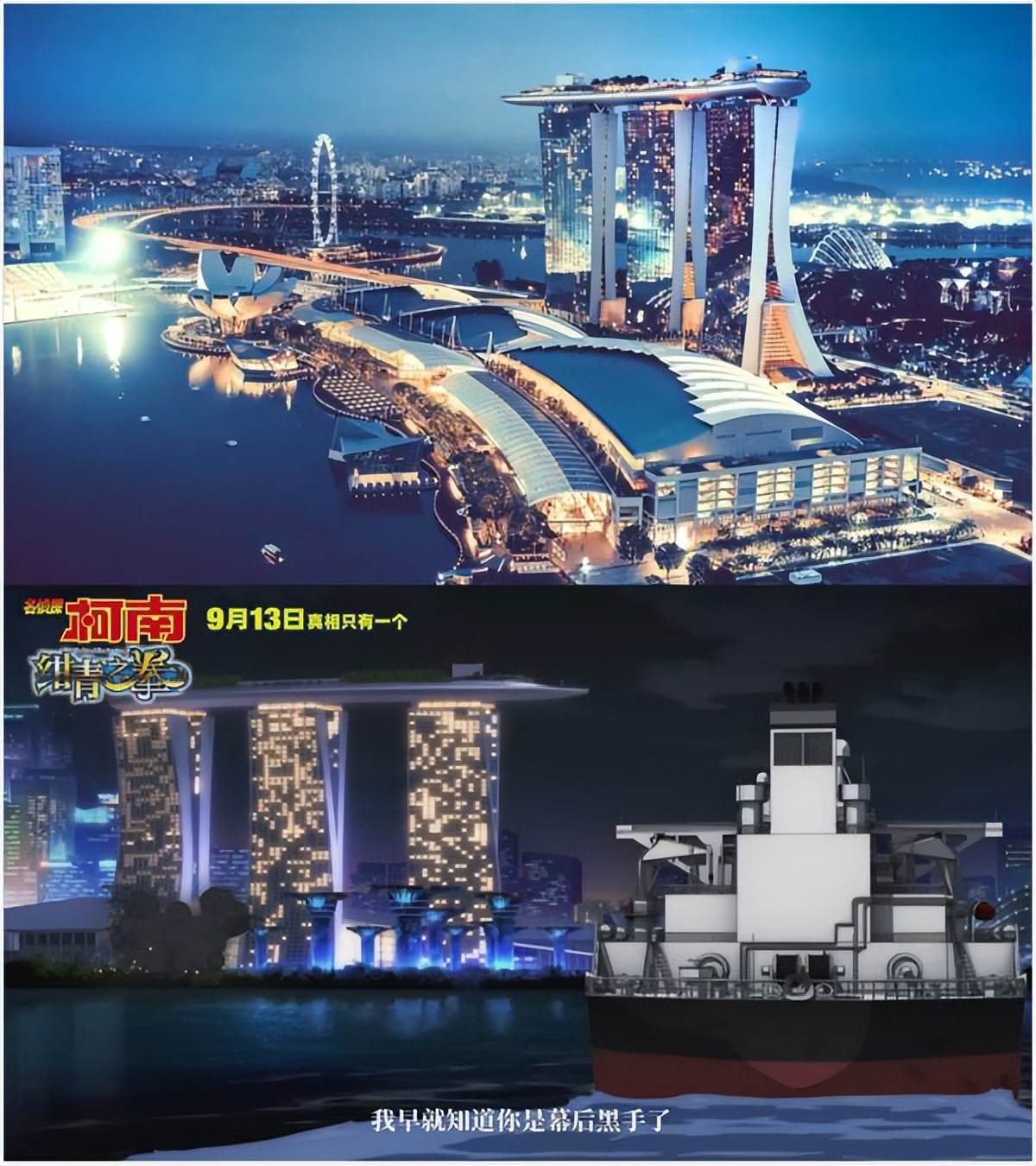 比如劇場版 M23《名偵探柯南:紺青之拳》,首次將舞臺完整搬到日本境外。電影開頭的兇殺案發生地,與結尾[高·潮]戰鬥的地點,正是隔著海灣彼此相望的兩處新加坡地標——魚尾獅公園與濱海灣金沙酒店。
