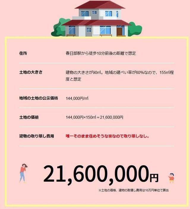 然后,得知小新家的建筑面積在90平方公尺,占據該區域土地的60%,推算出土地面積約為155平方公尺,按照當地公開的土地價格,最后便推算出該房屋的大概價格為2160萬日元,看來這房子的檔次還真不一般。