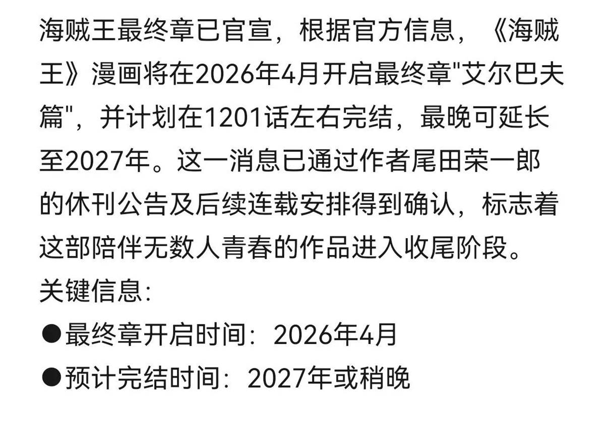 因此,2027年完結海賊王,是不可能的。《海賊王》如今的世界觀和它多年積累的伏筆、故事都讓它無法草草了結,否則必然會爛尾,尾田也被全球動漫迷噴死!