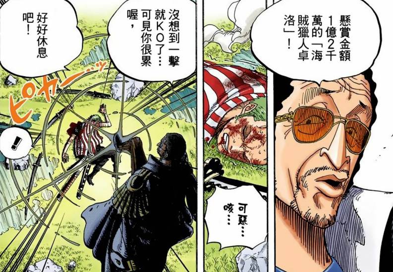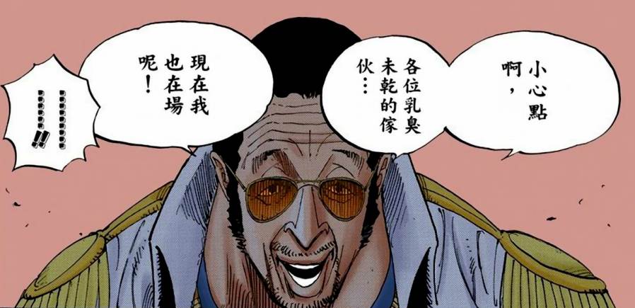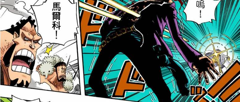 黃猿對戰4船長時,主打的就是一個實力碾壓,拳打打碟男,腳踢霍金斯,一腳一個小朋友,動作行雲流水絲毫不見手軟,完美詮釋什麼叫做「海軍本部的最高戰力」。(詳見漫畫509、510話)