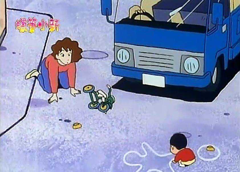 為了演得逼真一些,還把自己的鞋子給脫掉了,所以美伢跑過來的時候由于視角的原因,只看到了倒在車前的三輪車跟一只鞋子,還以為小新是出了交通事故了呢!