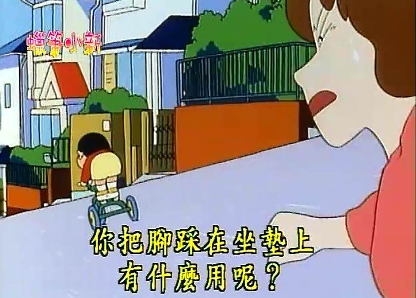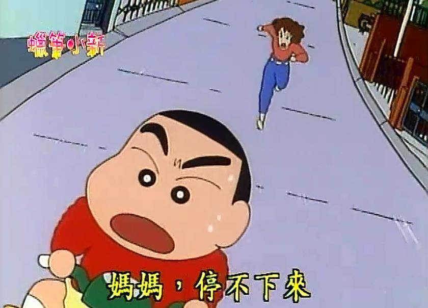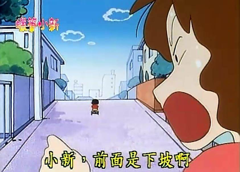 美伢也是心急如焚,讓小新趕緊剎車,用自己的兩只腳剎車。但是,小新完全沒有領會美伢的用意,還把自己的雙腳都踩在了三輪車的后方坐墊上面。