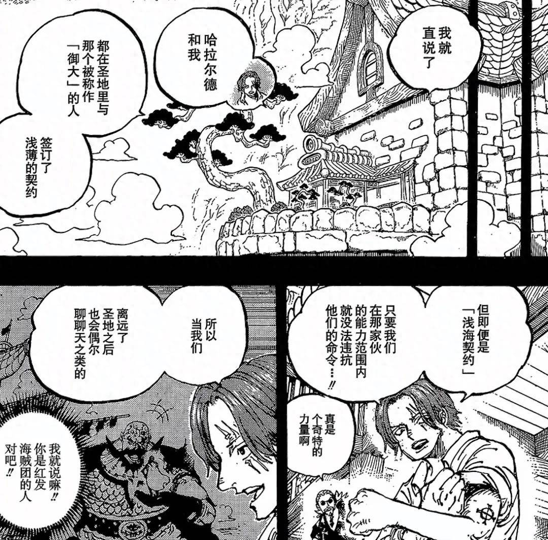 在1169話,香克斯說明淺海契約和說深海契約的區別,簽約深海契約會被伊姆完全控制,包括簽約人的身心和意識。但淺海契約在一定的范圍內才會被伊姆控制,因此香克斯遠離聖地才會和哈拉爾德溝通。
