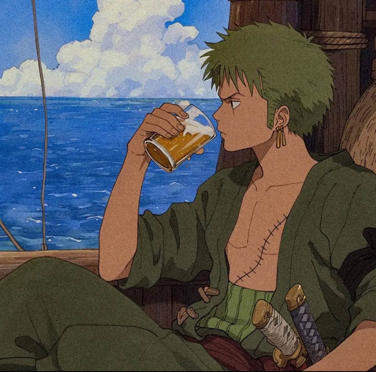索隆睜眼了,變身二刀流了, 金色耳墜也變兩個了。雖然說原作的更帥氣,但如果變成這樣也愛,感覺變得更加幼小了,像是未成年,喝酒不太合適。