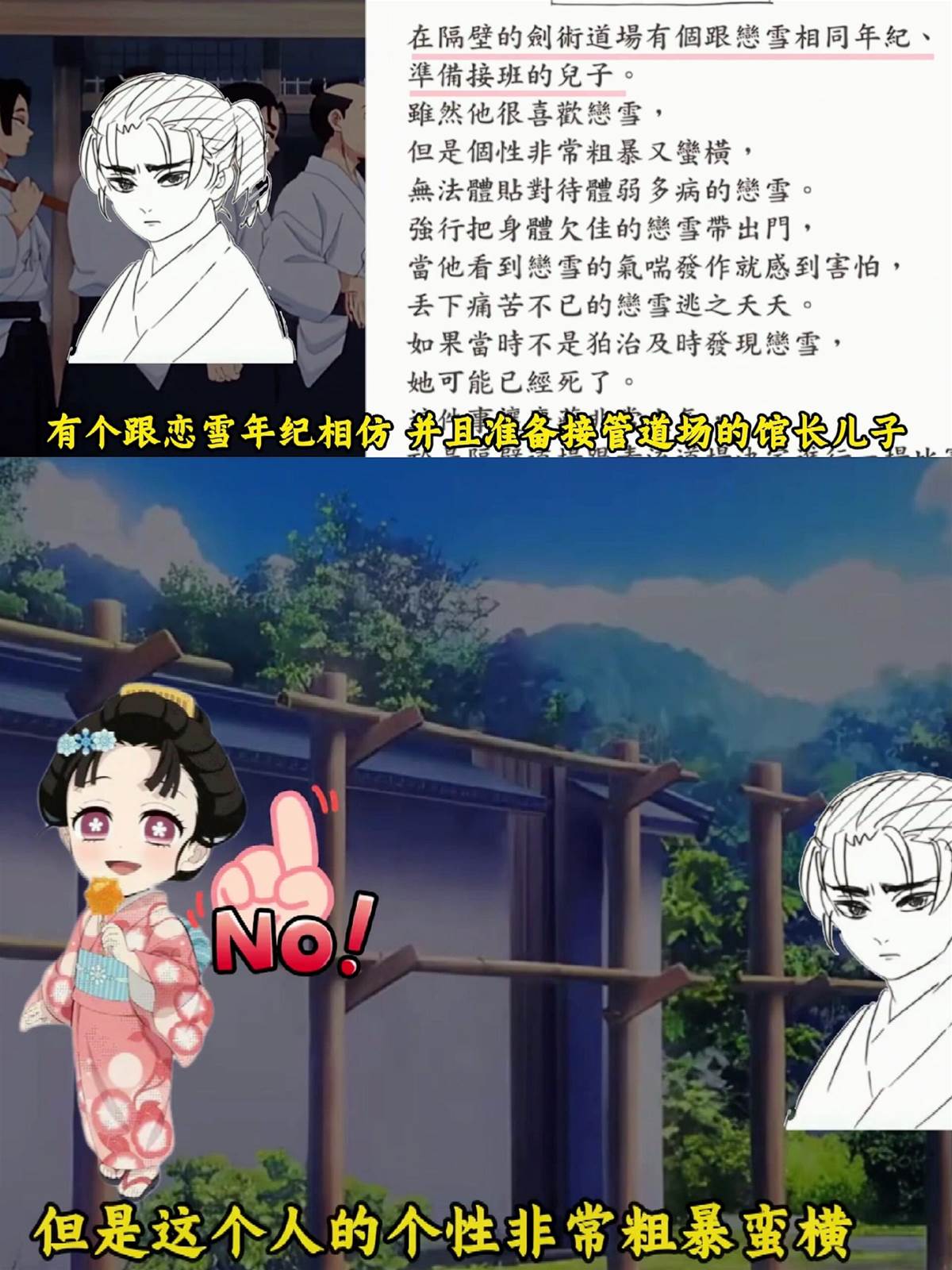原著附錄揭露了真相:他也「喜歡」戀雪,但這喜歡充滿控制欲——強行拉體弱的她出門導致發病 後來比試慘敗給狛治,連佩劍都被打斷。