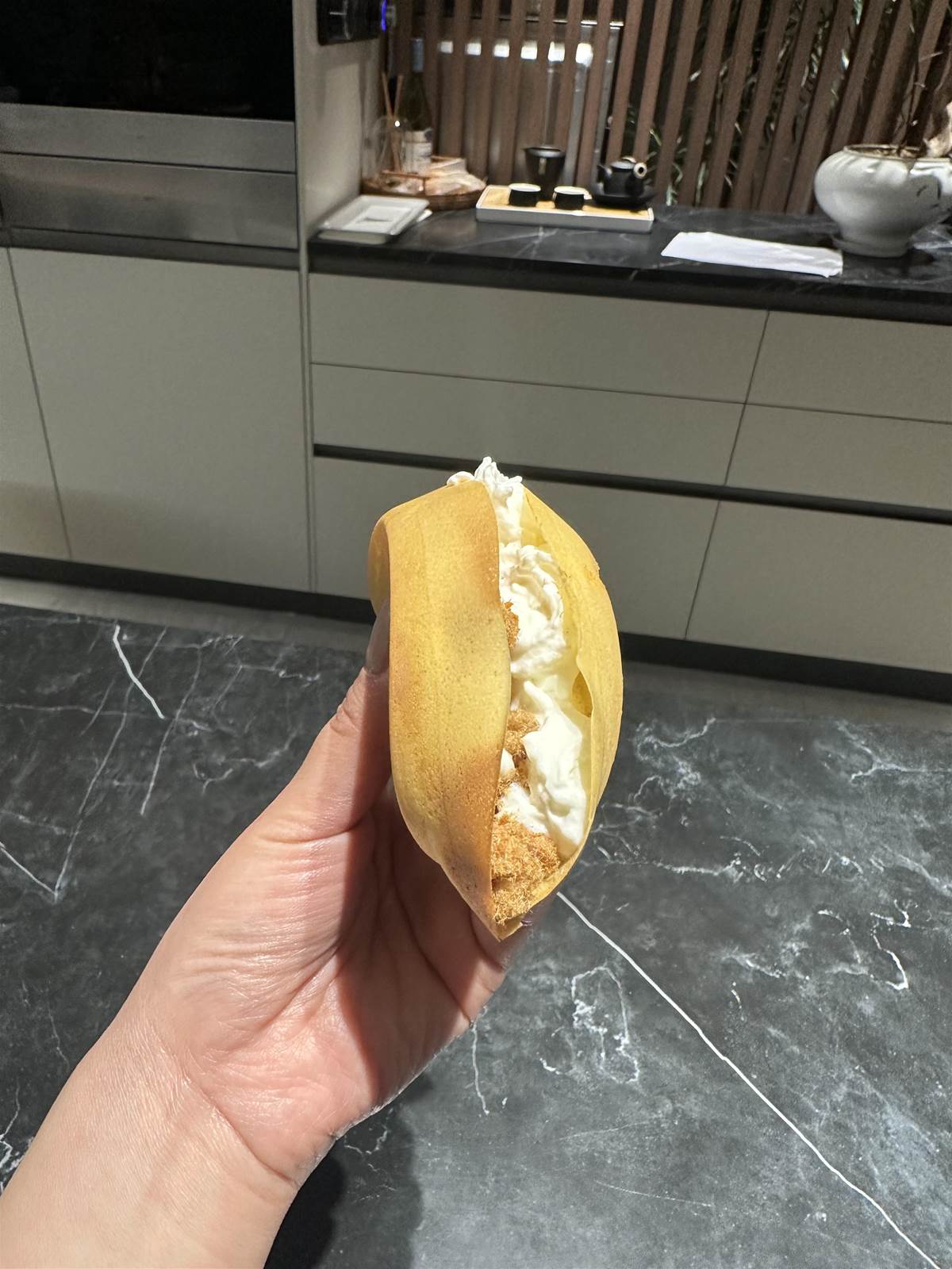 把蛋烘糕拿出來,稍微放涼一點點(小心燙嘴!),擠上奶油,馬上開吃!外皮脆、內裡軟,一口下去超幸福~