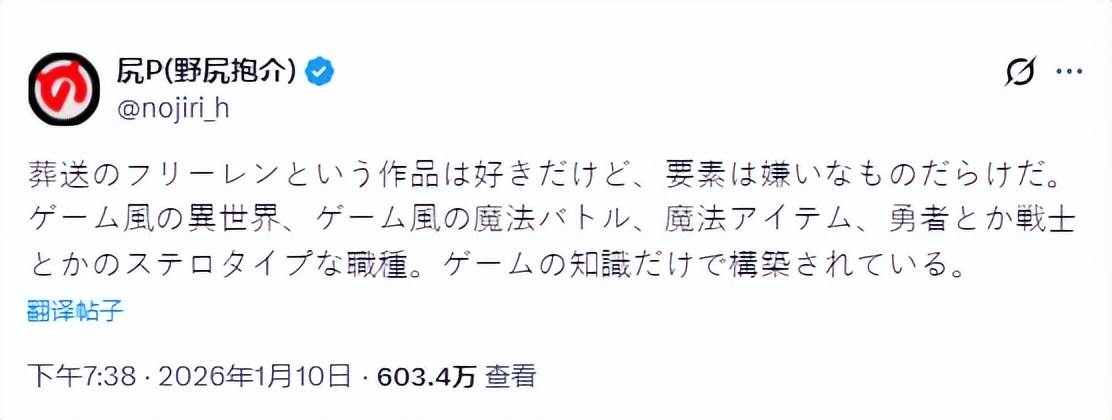 野尻抱介在 X(原推特)上直言不諱地表示: