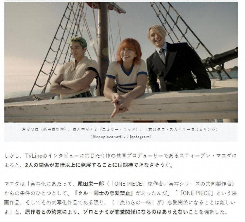 只不過「索娜」這對CP雖然很圈粉,但他們在一起的可能性卻幾乎為零。《海賊王》真人劇的編劇曾明確表示,娜美和索隆不可能發展友情以上的關系,原因很簡單,當初要拍攝真人版的時候,作者尾田榮一郎提出的條件之一就是禁止船員之間的戀愛,還說只要是《海賊王》的漫畫和真人劇,草帽一伙就很難成為戀愛關系。