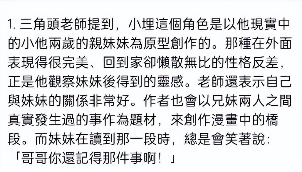 三角頭老師表示小埋這個角色是以現實中小他兩歲的親妹妹為原型設計的,漫畫中有一些情節還是現實中他和妹妹之間真實發生過的事情。