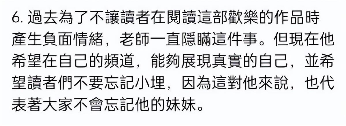 二妹妹的離世也讓三角頭老師深受打擊,甚至還因為過度悲傷一度想停止小埋這個角色創作,並向編輯申請休刊。