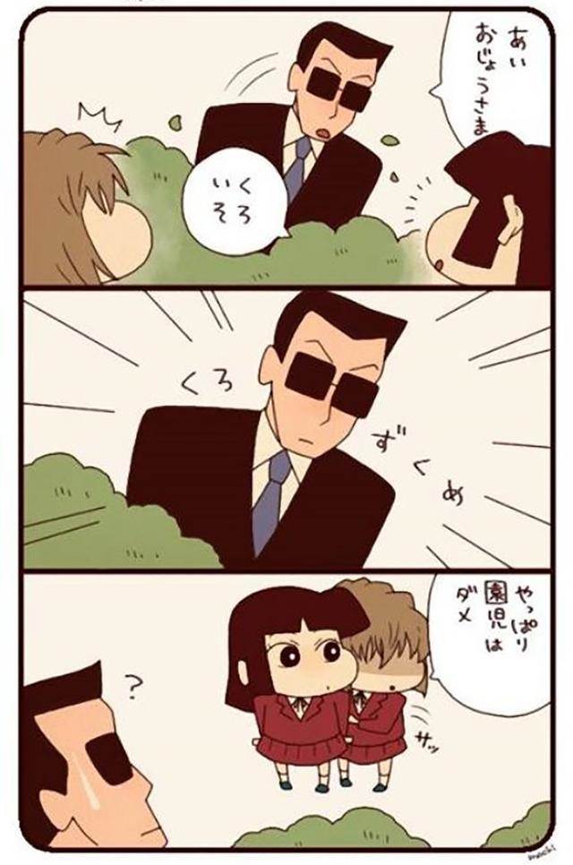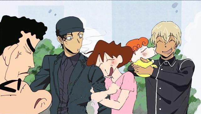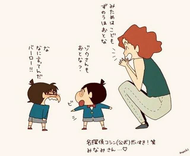 emmm......第一張圖,乍一看好像也沒什麼不對勁啊。不就是小新的父母抱著跟柯南一樣衣服的小新嘛,也沒啥特別的地方啊......但是,再看一眼就會一聲驚呼:沃德媽啊!魔鬼嘛!用《蠟筆小新》的畫風畫出了廣志版工藤新一跟美伢版毛利蘭的成年時的模樣,但是.....兩人抱著的仔仔們有點奇怪,一個是長得像工藤新一的柯南,這個沒有毛病。但是.....另一個蠟筆小新一樣的臉.