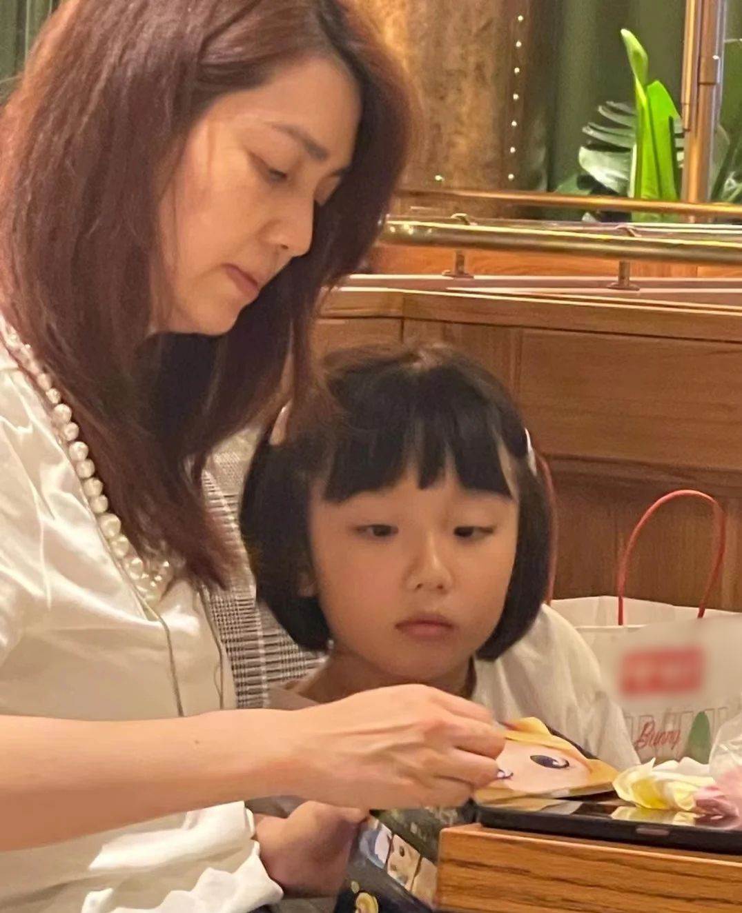 照片中只有洪欣和女兒兩人,洪欣手上似乎是在為女兒整理著玩具。可以看出洪欣是素顏出街,坐在洪欣一旁的小女兒剪了「蘑菇頭」十分稚嫩可愛,高挺的鼻樑完美地繼承了母親洪欣,而她的整體輪廓又神似父親張丹峰,顏值可謂是非常高了。