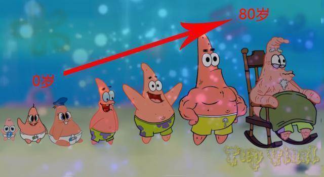 中年時的他身上竟然出現了肌肉,可以說是很強壯,老年的派大星看起來還是比較滄桑的,身上的肌肉全都消失了,臉上的表情也是非常的疲憊。