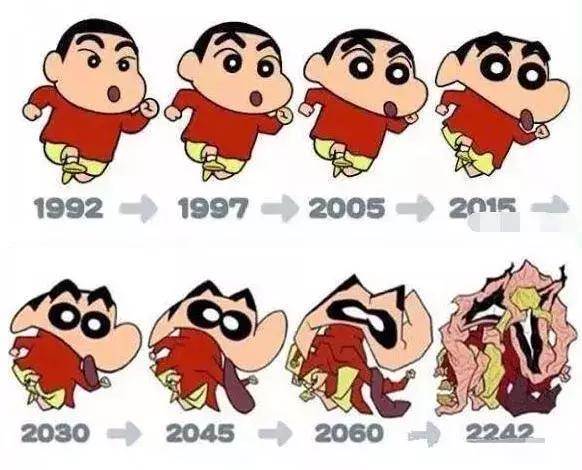 點評:在90後的兒時記憶中,除了小丸子之外一定少不了蠟筆小新這位調皮小毛孩。此圖是小新在過去20多年間的容貌變化,以及在未來200多年之後的容貌預測。演變趨勢是一脈相承的,臉蛋變瘦,眼睛撐大,嘴巴越來越長。最後,最後也只能成為一趟肉醬了,實在讓人毛骨悚然,不過啊你們看外星人不都是同一個醜不拉幾的外貌嗎?小新真的有可能在未來進化成這樣也說不定呢。